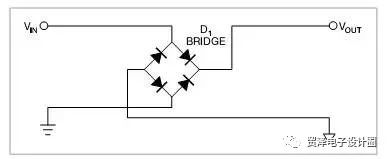 圖2 是一個(gè)橋式整流器,不論什么極性都可以正常工作,但是有兩個(gè)二極管導(dǎo)通,功耗是圖1的兩倍