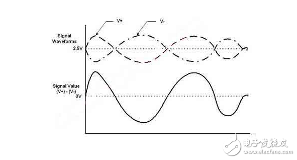 我們用一個(gè)方法對(duì)差分信號(hào)做一下比喻,差分信號(hào)就好比是蹺蹺板上的兩個(gè)人,當(dāng)一個(gè)人被蹺上去的時(shí)候,另一個(gè)人被蹺下來(lái)了 - 但是他們的平均位置是不變的。繼續(xù)蹺蹺板的類(lèi)推,正值可以表示左邊的人比右邊的人高,而負(fù)值表示右邊的人比左邊的人高。0 表示兩個(gè)人都是同一水平。應(yīng)用到電學(xué)上,這兩個(gè)蹺蹺板用一對(duì)標(biāo)識(shí)為V+和V-的導(dǎo)線來(lái)表示。