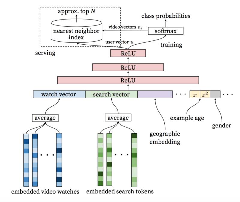 使用這一兩步方法,我們可以基于一個(gè)非常巨大的視頻語(yǔ)料庫(kù)推薦視頻,同時(shí)保證推薦的少量視頻是個(gè)性化的。這一設(shè)計(jì)也允許我們混合從其他來(lái)源生成的候選視頻。