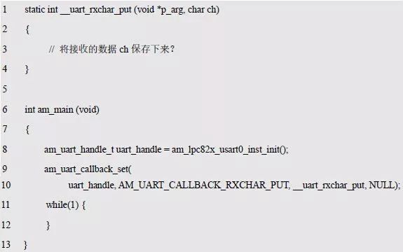 以提交一個已經(jīng)接收到的字符為例,pfn_callback 參數(shù)的類型為am_uart_rxchar_put_t: