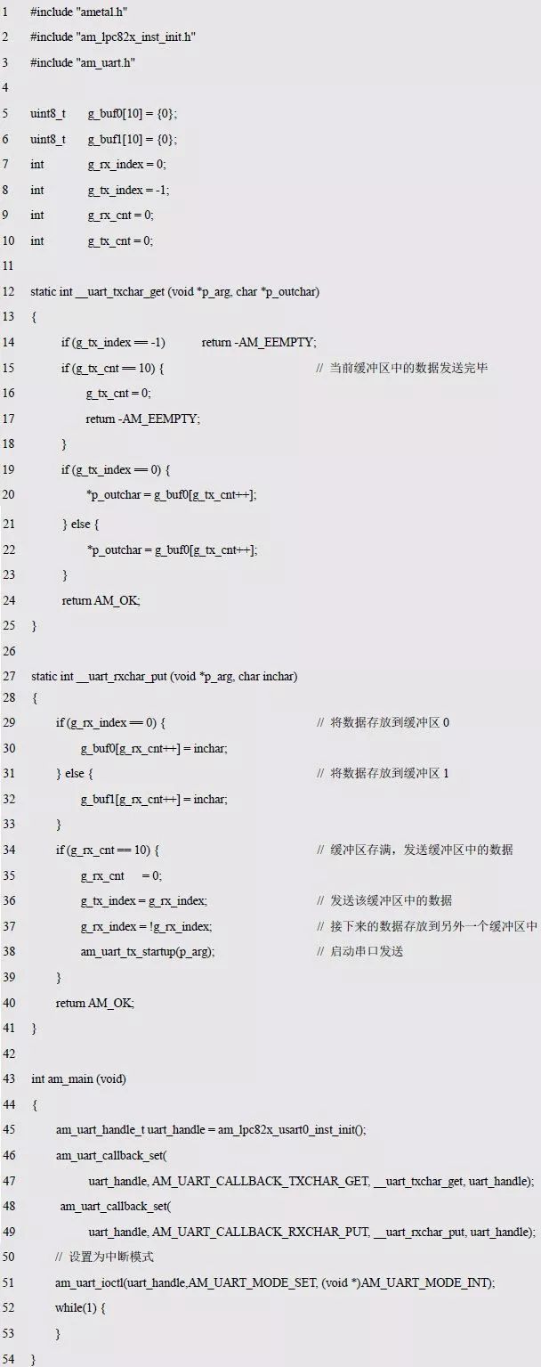 該程序的功能是將每次收到的10 個數(shù)據(jù)原封不動地發(fā)送出去,am_main()函數(shù)中的主循環(huán)可以不參與任何處理,即可實現(xiàn)串口數(shù)據(jù)的收發(fā)。