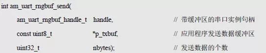其中, p_dev 為指向am_uart_rngbuf_dev_t 類型的帶緩沖區(qū)的串口實例指針,在使用時,只需要定義一個am_uart_rngbuf_dev_t 類型(am_uart_rngbuf.h)的實例即可: