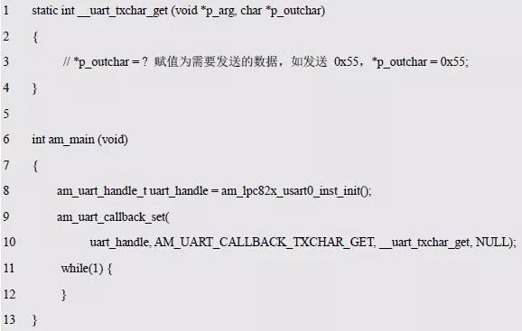 以獲取一個待發(fā)送的字符為例,pfn_callback 參數(shù)的類型為am_uart_txchar_get_t: