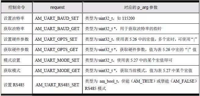 常見命令與對應(yīng)的p_arg 參數(shù),UART 硬件參數(shù)與UART 模式分別詳見表5.25、表5.26和表5.27。