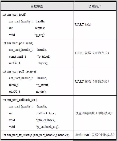 AMetal 提供了5 個與UART 相關(guān)的標(biāo)準(zhǔn)接口函數(shù)(am_uart.h),詳見表5.24。