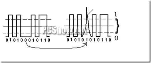 所周知,在傳統(tǒng)的單端(Single-ended)通信中,一條線路來(lái)傳輸一個(gè)比特位。高電平表示為"1",低電平表示為"0"。倘若在數(shù)據(jù)傳輸過(guò)程中受到干擾,高低電平信號(hào)完全可能因此產(chǎn)生突破臨界值的大幅度擾動(dòng),一旦高電平或低電平信號(hào)超出臨界值,信號(hào)就會(huì)出錯(cuò)(圖7)。