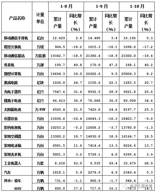 1~10月,產(chǎn)量增長幅度較快的產(chǎn)品有工業(yè)機器人、傳真機、鋰離子電池、光電子器件,分別同比增長68.9%、40.2%、34.6%、25.6%。太陽能電池同比增長25.3%、集成電路同比增長20.7%,家用空調器同比增長18.5%;1~10月,產(chǎn)量下降幅度較大的產(chǎn)品有移動通信基站、程控交換機儀器儀表,分別同比下降18.4%、17.2%和9.0%(見下表):