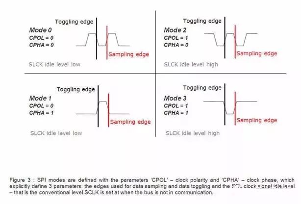 SPI有四種操作模式——模式0、模式1、模式2和模式3,它們的區(qū)別是定義了在時鐘脈沖的哪條邊沿轉(zhuǎn)換(toggles)輸出信號,哪條邊沿采樣輸入信號,還有時鐘脈沖的穩(wěn)定電平值(就是時鐘信號無效時是高還是低)。每種模式由一對參數(shù)刻畫,它們稱為時鐘極(clock polarity)CPOL與時鐘期(clock phase)CPHA。