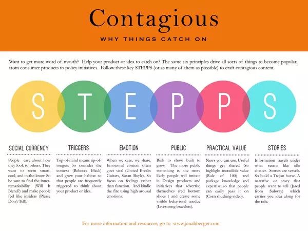 他的這套法則簡稱為STEPPS,取自他總結(jié)的每個因素的首字母。在喬納·伯杰看來,如果人們愿意瘋狂地傳播某些產(chǎn)品、思想和行為,要歸因于以下六個因素:社交貨幣(Social Currency)、誘因(Triggers)、情緒(Emotion)、公共性(Public)、實用價值(Practical Value)、故事(Stories)。