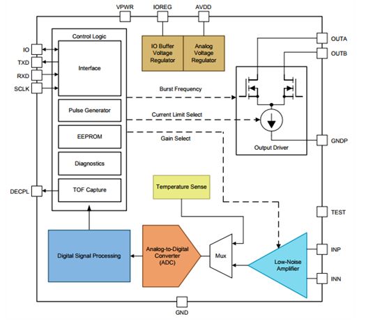 超聲波傳感技術(shù)也是一項(xiàng)具有成本競(jìng)爭(zhēng)力的技術(shù),特別是在使用PGA460等集成解決方案時(shí),其中已包括大部分所需的芯片。PGA460既可以使用半橋或H橋直接驅(qū)動(dòng)傳感器,也可以使用變壓器驅(qū)動(dòng)傳感器;后者主要用于密封的的“密閉”傳感器。PGA460還包括用于接收和調(diào)節(jié)超聲回波的完整模擬前端。此外,該器件還可以通過數(shù)字信號(hào)處理來計(jì)算ToF(見圖4)。