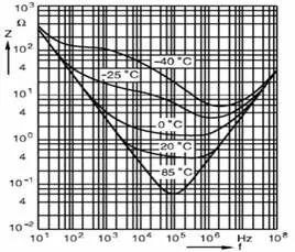 在開關(guān)電源輸出端用的濾波電容,與工頻電路中選用的濾波電容并不一樣,在工頻電路中用作濾波的普通電解電容器,其上的脈動電壓頻率僅有100Hz,充放電時間是毫秒數(shù)量級,為獲得較小的脈動系數(shù),需要的電容量高達(dá)數(shù)十萬微法,因而一般低頻用普通鋁電解電容器制造目標(biāo)是以提高電容量為主,電容器的電容量、損耗角正切值以及漏電流是鑒別其優(yōu)劣的主要參數(shù)。在開關(guān)穩(wěn)壓電源中作為輸出濾波用的電解電容器,由于大多數(shù)的開關(guān)電源工作在方波或矩形波的狀態(tài),含有及其豐富的高次諧波電壓與電流,其上鋸齒波電壓的頻率高達(dá)數(shù)十千赫,甚至數(shù)十兆赫,它的要求和低頻應(yīng)用時不同,電容量并不是主要指標(biāo),衡量它好壞的則是它的阻抗頻率特性,如圖3所示。