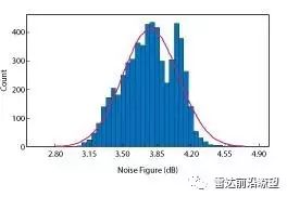 圖6 ATD T/R模塊的噪聲系數(shù)分布。柱狀圖接近平均噪聲系數(shù)3.7 dB的正態(tài)分布。