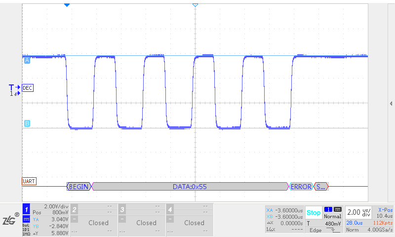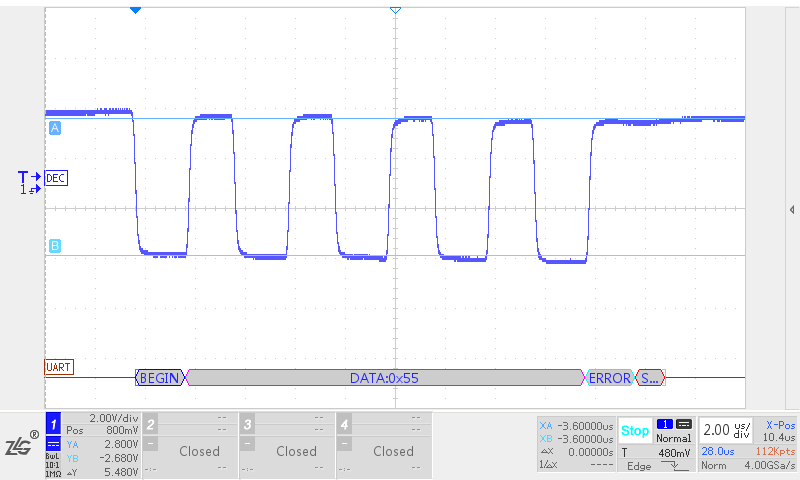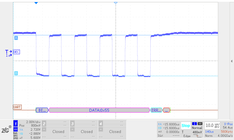 RS-485總線上的負(fù)載越大,RS-485收發(fā)器輸出差分電壓幅值越低,RSM485ECHT在5m,500kbps的情況下不加終端電阻和加終端電阻的波形如圖3和圖4所示,可以看出驅(qū)動信號在增加終端電阻后降低了2V左右。