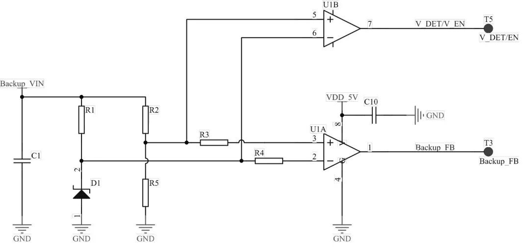 此外系統(tǒng)掉電情況需要掉電檢測電路實(shí)現(xiàn)。使用一顆比較器器件即可,注意使用Output_VCC端供電,以確保外部掉電時(shí),比較器仍然可以工作。比較器負(fù)端連接一個(gè)參考電壓,參考電壓由穩(wěn)壓二極管提供。正常供電時(shí),比較器輸出電壓由升壓電路的反饋端分壓決定;掉電時(shí),比較器輸出低電平,此時(shí)處理器仍未掉電,收到狀態(tài)信息可及時(shí)響應(yīng)處理。另一路掉電檢測可供其它功能使用。