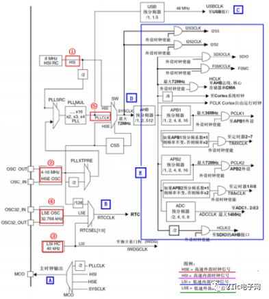 眾所周知STM32有5個時鐘源HSI、HSE、LSI、LSE、PLL,其實它只有四個,因為從下圖中可以看到PLL都是由HSI或HSE提供的。