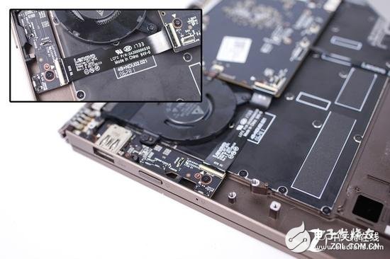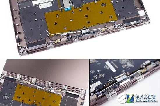 取下觸控板后可以清晰的看到前部兩個(gè)降噪麥克風(fēng)的排線走線,可以說是相當(dāng)?shù)墓ふ?/p>