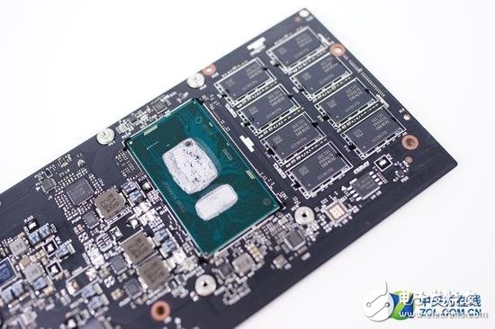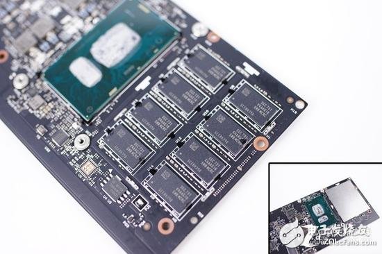 回到主板正面,去除內(nèi)存顆粒的金屬屏蔽罩,可以看到8顆內(nèi)存顆粒整整齊齊的分布在主板上,組成16GB的內(nèi)存容量。