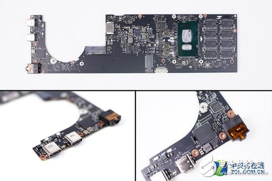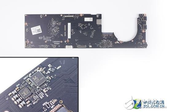 雷電接口旁邊的一個(gè)巨大芯片,應(yīng)該跟雷電接口的控制有關(guān)。另外主板的電路控制部分有一些聯(lián)想定制的控制芯片,這也是歷代YOGA主板上經(jīng)常見到的。