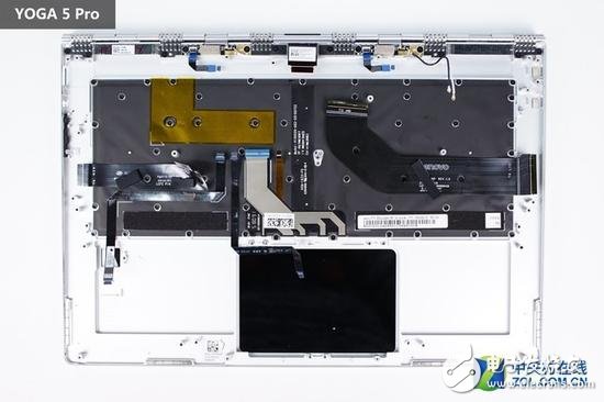 回到C殼,可以看到剩下的排線也十分的整潔。擰下多達(dá)50多顆鍵盤的固定螺絲后,即可取下整個(gè)鍵盤,這樣的設(shè)計(jì)與YOGA 5 Pro是一模一樣的。