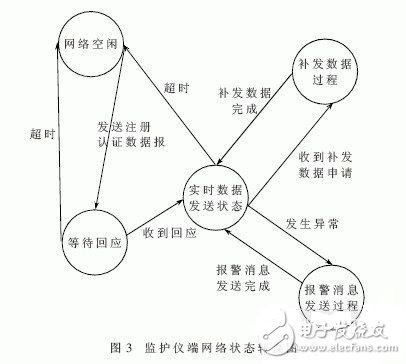 網(wǎng)絡(luò)狀態(tài)轉(zhuǎn)換圖如圖3,由此設(shè)計(jì)的網(wǎng)絡(luò)接口函數(shù)為:(1)TransData():負(fù)責(zé)發(fā)送實(shí)時(shí)數(shù)據(jù)、補(bǔ)發(fā)數(shù)據(jù)和發(fā)送報(bào)警消息,其中報(bào)警消息具有最高優(yōu)先級(jí),連續(xù)性的發(fā)送策略補(bǔ)發(fā)數(shù)據(jù)優(yōu)先級(jí)高于實(shí)時(shí)數(shù)據(jù),實(shí)時(shí)性的發(fā)送策略發(fā)送優(yōu)先級(jí)與連續(xù)性策略相反;(2)ECGRegister():負(fù)責(zé)建立與服務(wù)器之間的ECG連接,函數(shù)定時(shí)發(fā)送注冊(cè)信息包和完成注冊(cè)過程確認(rèn)。