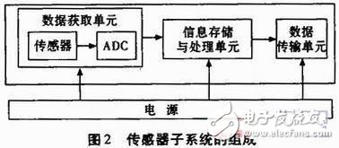 傳感器、感知對(duì)象和觀察者是傳感器網(wǎng)絡(luò)的三個(gè)基本要素。網(wǎng)絡(luò)中的傳感器節(jié)點(diǎn)(或稱為傳感器子系統(tǒng))由電源、數(shù)據(jù)獲取單元、信息存儲(chǔ)與處理單元和數(shù)據(jù)傳輸單元構(gòu)成,如圖2所示。電源為傳感器提供正常工作所必需的能源。數(shù)據(jù)獲取單元用于感知、獲取外界的信息,并將其轉(zhuǎn)換為數(shù)字信號(hào)。信息存儲(chǔ)與處理單元對(duì)數(shù)據(jù)獲取單元傳來的信息進(jìn)行必要的處理、保存,數(shù)據(jù)傳輸單元負(fù)責(zé)與其他傳感器或接收發(fā)送器之間的通信。觀察者是傳感器網(wǎng)絡(luò)的用戶,是感知信息的接受者或任務(wù)管理者,觀察者可以是人,也可以是計(jì)算機(jī)或其他設(shè)備。