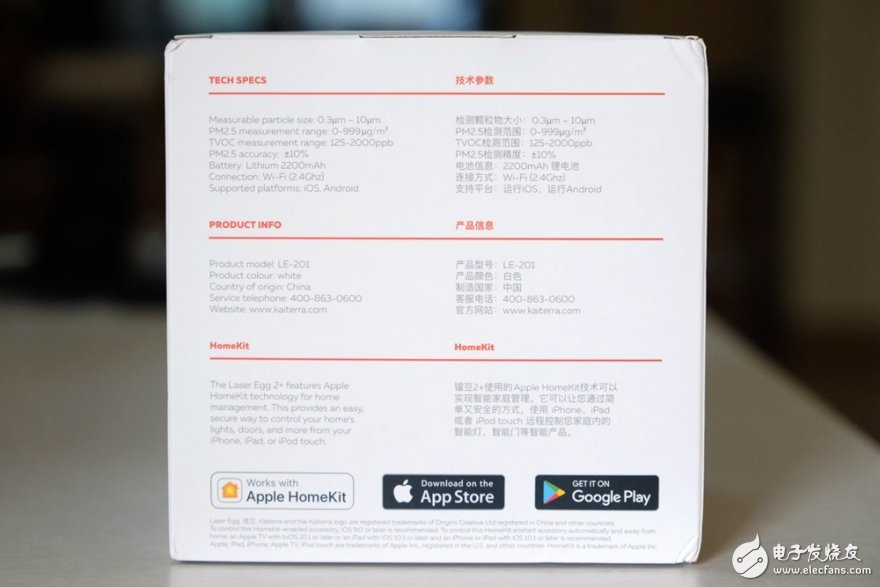 鐳豆2+采用一個類似正方體的白色紙盒包裝,盒子外層還設有一個紙盒套,機器的技術參數(shù)、產(chǎn)品信息和產(chǎn)品特點以中英兩種文字印刷在紙盒套上,紙盒套正面的右上角印有的“鐳豆2+”也特別醒目。在鐳豆2+之前,原點生活科技就推出了鐳豆和鐳豆2兩代智能空氣質量檢測儀,它的品質不僅僅贏得多國大使館以及世界500強企業(yè)的信賴,而且還是世界上第一款且唯一一款入駐蘋果店的PM2.5檢測儀。