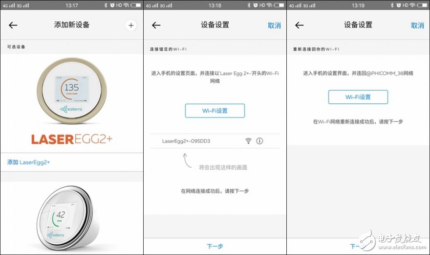 初次運行Kaiterra,需要進行添加新設備操作,這個步驟很簡單,跟著向導提示一步一步來即可。需要注意的是鐳豆2+只支持2.4GHz頻段,而現(xiàn)在很多路由器都是支持2.4GHz和5GHz頻段,所以在連接鐳豆2+的WiFi時,切記要選擇2.4GHz的頻段。