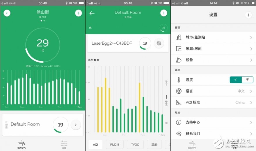 Kaiterra的主界面還算比較友好,簡潔直觀,屏幕大部分區(qū)域顯示的當?shù)爻鞘斜O(jiān)測站的綜合指數(shù)信息和每小時指數(shù)變化的柱狀圖表,而下方則是鐳豆2+實時檢測的綜合指數(shù)。進入查看鐳豆2+實時檢測數(shù)據(jù)界面,可以更加直觀地了解到它的AQIPM2.5、TVOC、溫度和濕度的檢測數(shù)據(jù),用戶可以以分鐘、小時或者天為單位進行查看。在設置選項里,還可以選擇中國或者美國的AQI標準,兩者差距頗大,可以看出美國的AQI標準要求更為嚴格。