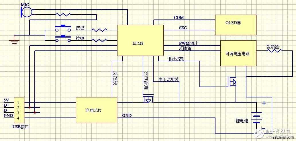 該框圖中鋰電池的電壓 3.3V~4.2V,氣流監(jiān)測可用咪頭或直接使用按鍵。 框圖中 OLED 是用來顯示電池電壓以及功率狀態(tài)。另外,按鍵除了有上述氣流監(jiān)測功能外,還可用來喚醒出煙和調(diào)整出煙量 (發(fā)熱絲功率)。作為主控單元 MCU,EFM8 對鋰電池過放和欠壓保護(hù),充電過程監(jiān)測和顯示,及其過充保護(hù),短路監(jiān)測等。以下是基于 EFM8 的電子煙電路原理圖。