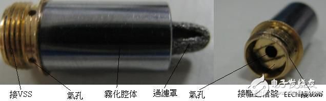 外殼為不銹鋼,鍍銅部分為煙身的螺絲接口,中心為氣孔,邊沿還有氣孔。氣流從接口邊沿進(jìn)入煙體,從而使煙體內(nèi)部有氣流。邊沿的氣孔也可噴發(fā)出煙體。內(nèi)部為加熱絲纏繞在圓柱黑色材料上,內(nèi)阻約 3 歐。 接口外面與 VSS 相連,中心控制芯片的驅(qū)動芯片好。