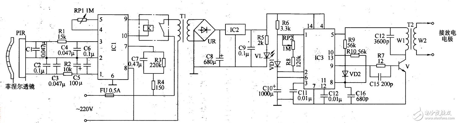 Tl選用3-5W、二次電壓為l5V的電源變壓器;T2使用電警具用脈沖變壓器或用ElO型磁心繞制。次繞組用φ0.49mm的漆包線繞30匝,一次繞組用φ0.12mm的漆包線繞2000匝。
