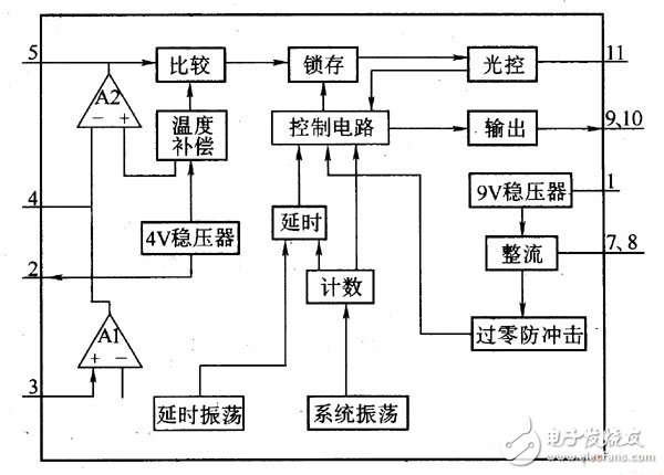 TWH9511是熱釋電紅外傳感器專用控制集成電路,其內(nèi)部包含輸入放大器、比較器、鎖存器、控制器、整流器、9V穩(wěn)壓器、4V穩(wěn)壓器等電路,如圖所示。