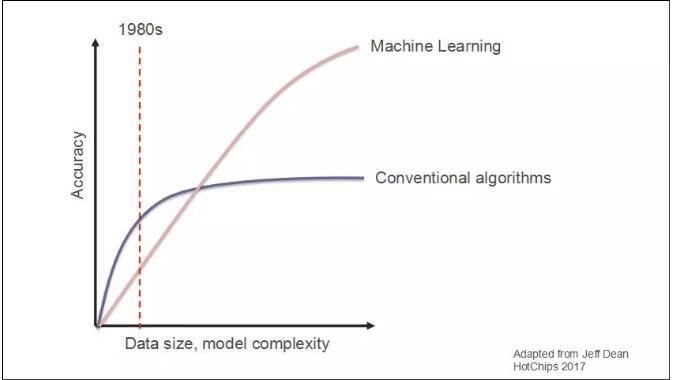 機器學習在20世紀80年代,這里顯示的是例如影像識別或者自然語言處理任務(wù)的準確度以及它跟你對于機器學習的算法所提供的數(shù)據(jù)規(guī)模的關(guān)系。
