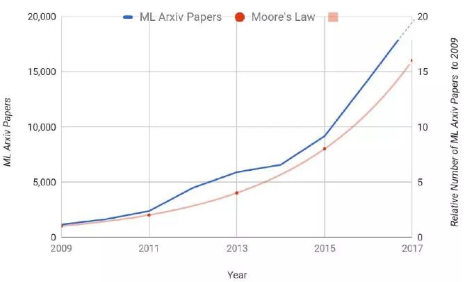 但問題是軟件的算法也沒有在原地踏步。這就給我們看到Arxiv的論文,在過去十幾年,關(guān)于機器學習的論文的增長,它的增長是比摩爾定律更快。我們看到有多新的想法不斷創(chuàng)造出來,但是我們沒有辦法去執(zhí)行這些好的想法。