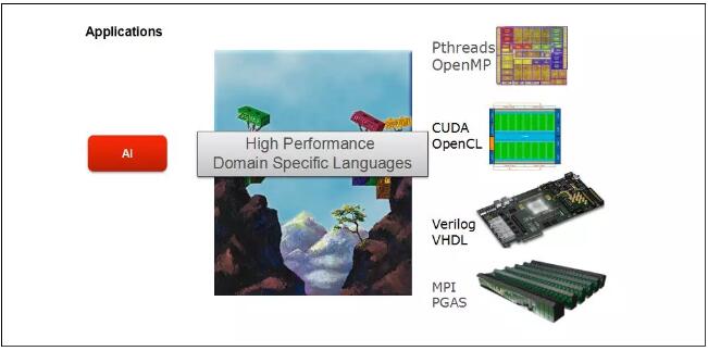 因此,我們可不可以編寫一個機器學習程序,它能夠在這些體系結(jié)構(gòu)上都高效運用。這樣就可以填補這個鴻溝了。我們把這個叫做適定于特定情況的語言?,F(xiàn)在有AI的應(yīng)用,把不同領(lǐng)域的語言結(jié)合起來,他們專注于這個應(yīng)用不同的組成部分。比如有一個比較稠密或者稀疏的算法,還有算法中的關(guān)系。比如你的重點是不是圖像的算法。