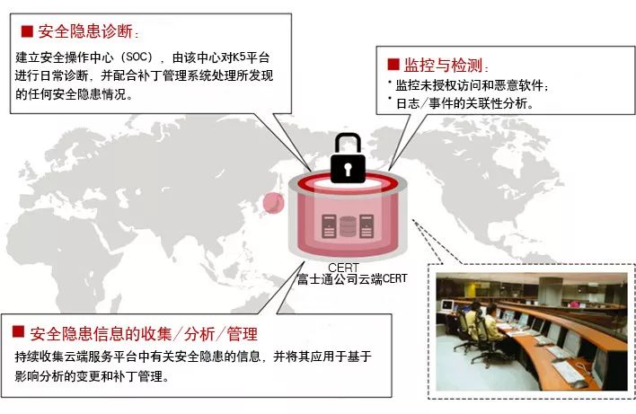 圖3:K5安全措施。在持續(xù)實(shí)施安全隱患診斷、監(jiān)控、以及其他安全措施的情況下每天24小時(shí)、每年365天操作K5。富士通公司的云端緊急響應(yīng)小組,即云端安全專家團(tuán)隊(duì),予以支持。