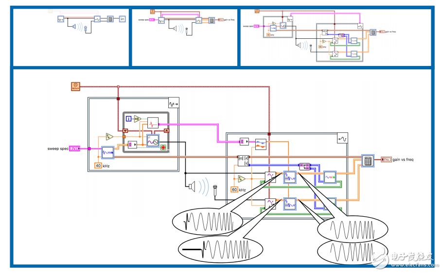 如果我們可以在LabVIEW中放置一個(gè)抽象設(shè)計(jì)節(jié)點(diǎn)并編輯它的圖標(biāo)來(lái)表示麥克風(fēng),用另一個(gè)圖標(biāo)來(lái)表示揚(yáng)聲器,為聲波添加一些剪貼畫(huà),我們可以快速生成一個(gè)草圖。