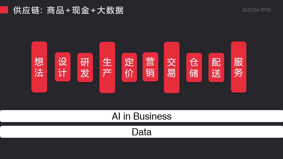 對于京東來說,京東有一條非常長的供應(yīng)鏈,我們覆蓋了整個零售的全流程。這里給我們一個很獨(dú)特的機(jī)會,我們能不能通過大數(shù)據(jù)把不同的環(huán)節(jié)進(jìn)行打通,使得我們對供應(yīng)鏈進(jìn)行改革,使得供應(yīng)鏈效率更敏捷。這是我們應(yīng)用人工智能很大的領(lǐng)域。