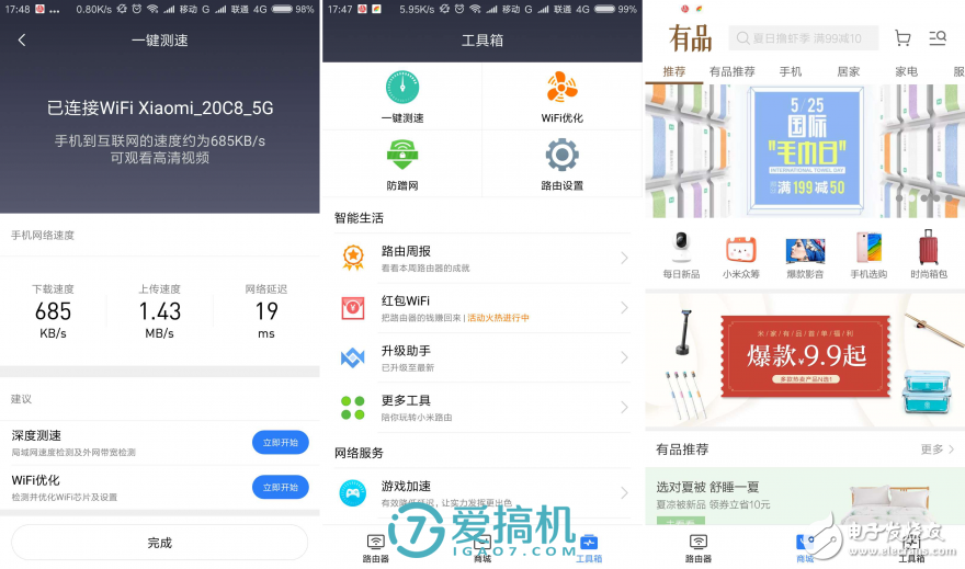 雖然小米路由器 4 在固件上的選擇較少,但自帶的各類功能插件基本也能滿足用戶的需求了。像是網(wǎng)速測(cè)試、WiFi 優(yōu)化、紅包 WiFi、游戲加速、防止蹭網(wǎng)等都是一應(yīng)俱全,用戶只需要在 app 中下載對(duì)應(yīng)的插件安裝即可,更方便一般的小白用戶。而作為小米自家的 app,還內(nèi)置了有品商場(chǎng)的快捷方式,方便隨時(shí)剁個(gè)手。