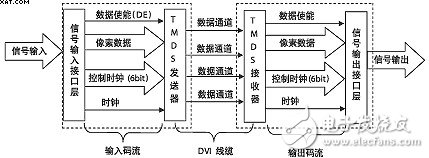 DVI 是基于TMDS(Transition Minimized Differential Signaling,轉(zhuǎn)換最小差分信號)技術(shù)來傳輸數(shù)字信號,TMDS運用先進的編碼算法把8bit數(shù)據(jù)(R、G、B中的每路基色信號)通過最小轉(zhuǎn)換編碼為10bit數(shù)據(jù)(包含行場同步信息、時鐘信息、數(shù)據(jù)DE、糾錯等),經(jīng)過DC平衡后,采用差分信號傳輸數(shù)據(jù),它和LVDS、TTL相比有較好的電磁兼容性能,可以用低成本的專用電纜實現(xiàn)長距離、高質(zhì)量的數(shù)字信號傳輸。TMDS技術(shù)的連接傳輸結(jié)構(gòu)如圖1所示。