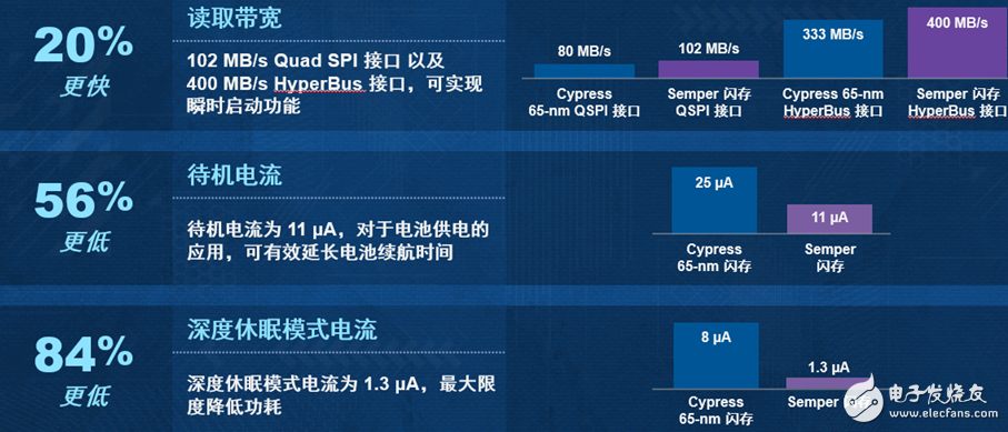 借助Cypress獨(dú)有的MirrorBit?技術(shù),產(chǎn)品密度最高可達(dá)到4GB,而且Semper NOR閃存的讀取速度相比上一代產(chǎn)品HyperBus而言提升了20%,從330 Mb/s Cypress 65nm HyperBus 接口提升到了400 Mb/s HyperBus 接口,可實(shí)現(xiàn)瞬時啟動功能,這也得益于他們精良的45nm做工工藝。在其他方面Cypress也做了些改良,Semper NOR閃存待機(jī)的電流更低,待機(jī)電流為11μA,可省電56%;深度休眠模式電流為1.3μA,比上一代產(chǎn)品低84%。