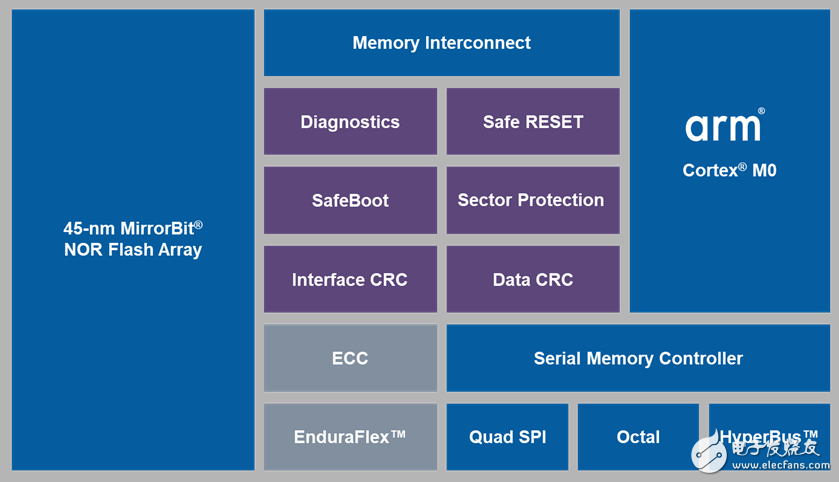 在閃存產(chǎn)品的架構(gòu)方面,對于大多數(shù)做存儲的公司來說,都會有NOR閃存的陣列,有一些甚至?xí)欣鏠uadSPI的接口。Semper Nor這款產(chǎn)品的最大亮點(diǎn)就是內(nèi)置的ARM Cortex M0芯片,它能執(zhí)行一些如:診斷、安全重啟、SafeBoot、保護(hù)、接口CRC(循環(huán)冗余碼校驗(yàn))等特別的功能,這些使得這款產(chǎn)品能夠完全滿足ISO 26262的標(biāo)準(zhǔn)。Sam著重強(qiáng)調(diào):“這個產(chǎn)品只是這個平臺的第一款產(chǎn)品,之后在這個平臺上會有更多的產(chǎn)品、更多不同的功能,所以我們要在這個平臺上不斷的增強(qiáng)、增加更多的功能和特點(diǎn),從而使總體擁有的成本降到最低?!?/p>
