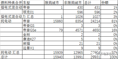 (4)吉利汽車是后起之秀。之前發(fā)現(xiàn)吉利銷量統(tǒng)計(jì)錯(cuò)了,之前把博瑞GE這個(gè)48V微混也搞到新能源銷量里了,去掉這個(gè)車后吉利的銷量?jī)H為3萬(wàn)輛,低于奇瑞和江淮了,我們發(fā)現(xiàn)吉利產(chǎn)品結(jié)構(gòu)里面,電動(dòng)車占比高達(dá)97%以上,其中帝豪占比到81%,其中有1.6萬(wàn)輛是做曹操專車的,這么看吉利的新能源跟前面三大巨頭還是有明顯差距的,但是看上去后勁十足。