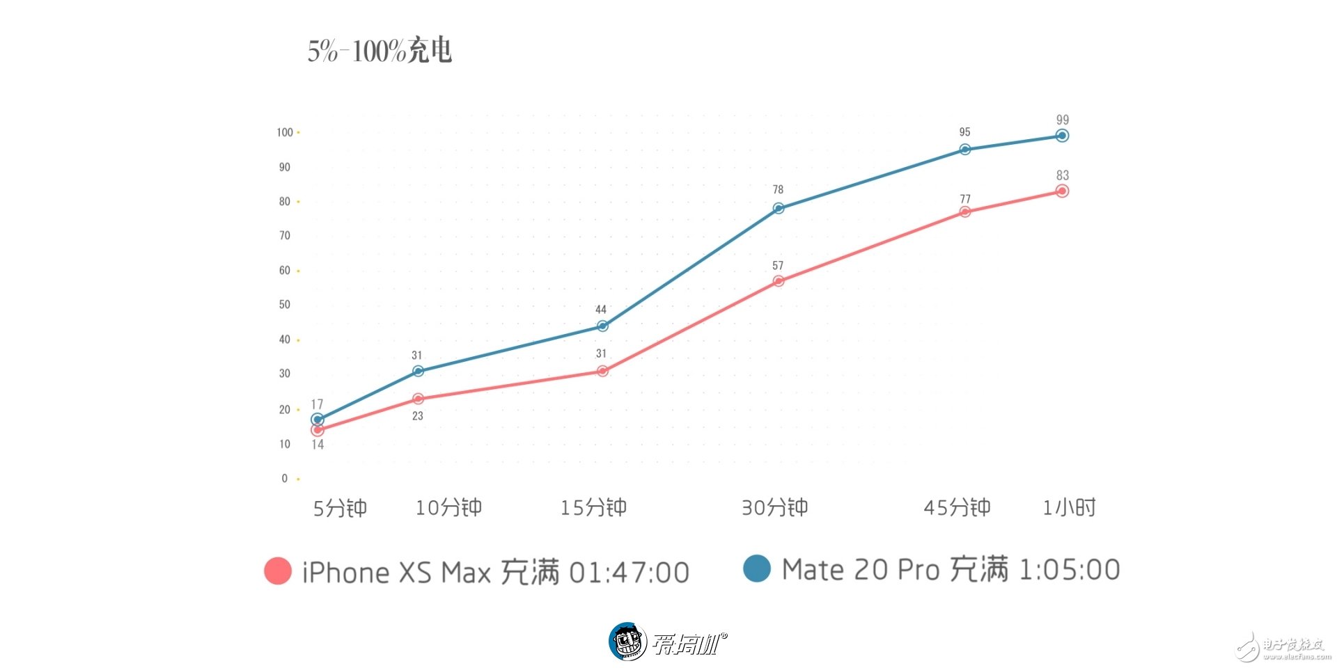 充電時(shí)間:我們用小米的 45W 頭給 XS Max 充,從 5% 開始,30 分鐘可以充到 57%,充滿一共需要 107 分鐘。而華為 Mate 20 Pro 在 30 分鐘時(shí)就可以充到 78%,充滿一共需要 65 分鐘,后期涓流會(huì)比較慢,但前期速度很 hi 快。