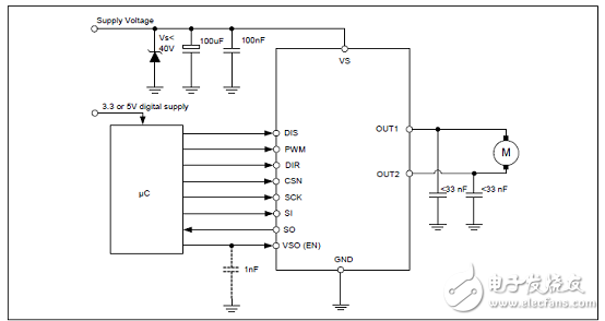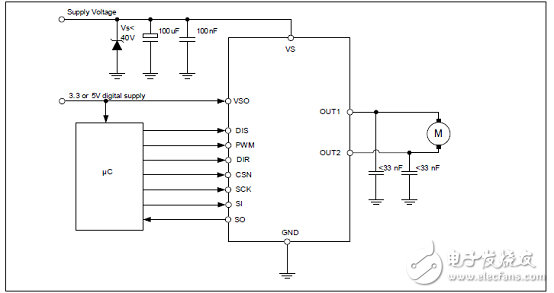 圖2.IFX9201SG帶SPI接口的H橋應(yīng)用電路圖