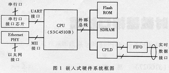 為了能使系統(tǒng)支持實時數(shù)據(jù)通信,需要在外設和嵌入式系統(tǒng)的外部總線之間加上 FIFO 和CPLD。FIFO 用于數(shù)據(jù)緩沖,CPLD 用于產(chǎn)生 FIFO控制邏輯和外部總線控制邏輯。