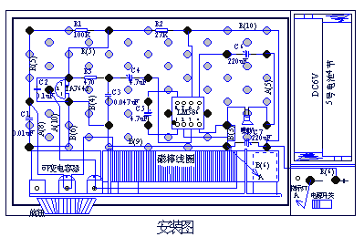 在初學(xué)電子知識(shí)時(shí),為了安全和擴(kuò)大普及面,讓更多年齡更小的學(xué)生能早一點(diǎn)接觸電子技術(shù),我們選用了螺孔板作為基本的安裝模板,因此安裝圖也就變成另一種模式,如圖: |
