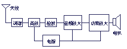 方框圖是一種用方框和連線來(lái)表示電路工作原理和構(gòu)成概況的電路圖。從根本上說(shuō),這也是一 種原理圖,不過(guò)在這種圖紙中,除了方框和連線,幾乎就沒(méi)有別的符號(hào)了。它和上面的原理圖主要的區(qū)別就在于原理圖上詳細(xì)地繪制了電路的全部的元器件和它們的 連接方式,而方框圖只是簡(jiǎn)單地將電路按照功能劃分為幾個(gè)部分,將每一個(gè)部分描繪成一個(gè)方框,在方框中加上簡(jiǎn)單的文字說(shuō)明,在方框間用連線(有時(shí)用帶箭頭的 連線)說(shuō)明各個(gè)方框之間的關(guān)系。所以方框圖只能用來(lái)體現(xiàn)電路的大致工作原理,而原理圖除了詳細(xì)地表明電路的工作原理之外,還可以用來(lái)作為采集元件、制作電 路的依據(jù)。下圖所示的就是上述收音機(jī)電路的方框圖 |