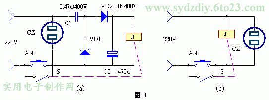 電路原理如附圖所示。220V市電經(jīng)C1、VD1、DW1為開