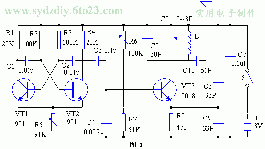 該裝置是由發(fā)射機(jī)和接收機(jī)兩部分組成的系統(tǒng),工作于調(diào)頻(FM)波段。發(fā)射機(jī)的電路工作原理見(jiàn)圖1(點(diǎn)擊下載原理圖)。它是由三極管VT1、VT2及其外圍元件構(gòu)成的多諧振蕩器,其工作頻率約為1000Hz,其信號(hào)通過(guò)電容器C3取出去調(diào)制由VT3及其LC元件構(gòu)成的調(diào)頻振蕩器,被調(diào)制的調(diào)頻信號(hào)從C10輸出,通過(guò)機(jī)內(nèi)微型天線向空間輻射。其中C6的作用是加寬頻帶并能有效防止人體感應(yīng)對(duì)頻率的影響。